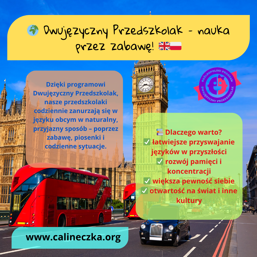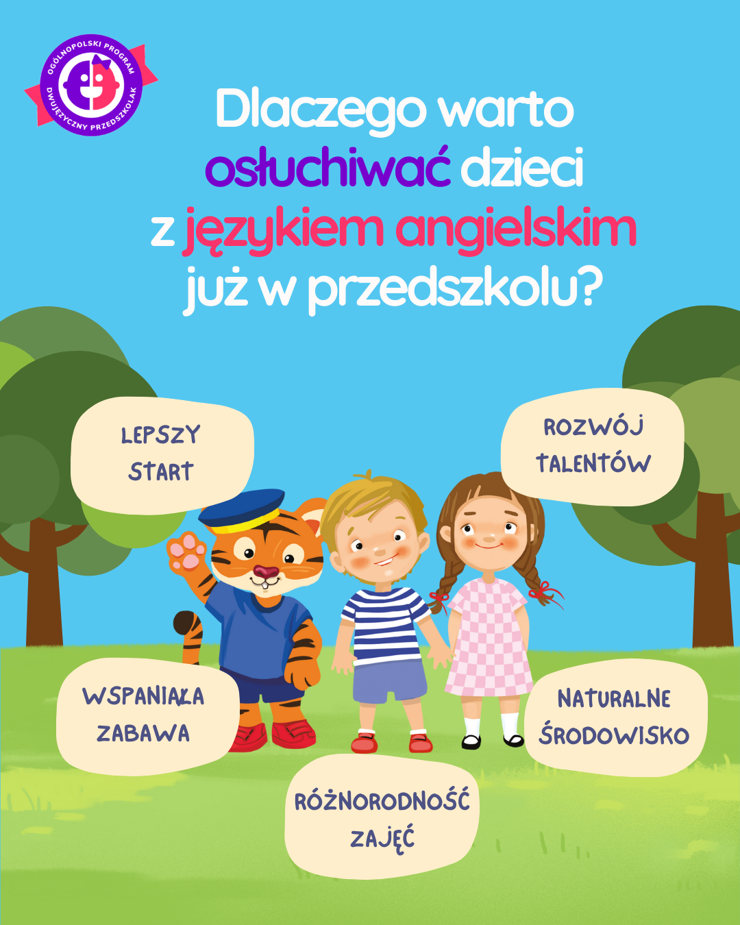 Jako pierwsze przedszkole w Chełmnie realizujemy program „Dwujęzyczny przedszkolak”. Osłuchiwanie się z drugim językiem, w naszym wypadku angielskim od najmłodszych lat ,przyczynia się do rozwoju otwartych postaw społecznych, tolerancji i oczywiście łatwości w komunikowaniu się i uczeniu kolejnych języków.